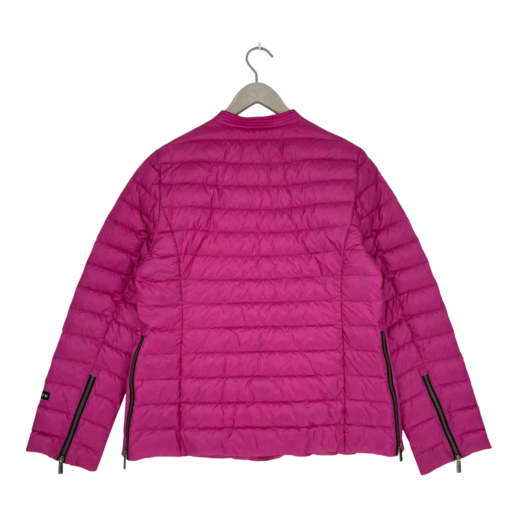 Horizontally stitched women's biker style lightweight down jacket. The jacket has zipper slits in the side seams and cuffs. Small stand-up collar and zippered pockets. Functional two-way zipper for added comfort.