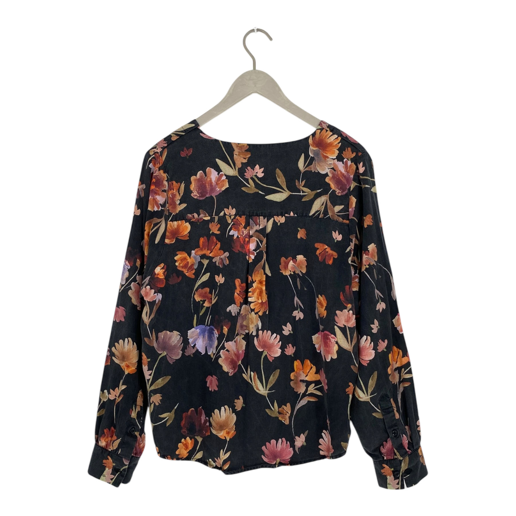 Kaiko women’s flowy blouse in a flower print. The blouse has buttons on the front and also on the sleeves.