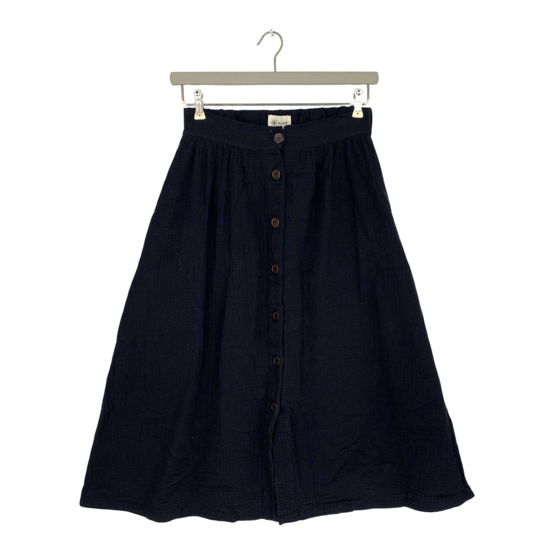 Kaiko midi-length skirt made of woven organic cotton double gauze is embellished with a row of buttons. The elastic waistband at the back makes the button skirt comfortable to wear. Double gauze does not require ironing and you can wear it straight from the clothesline. Unlined.