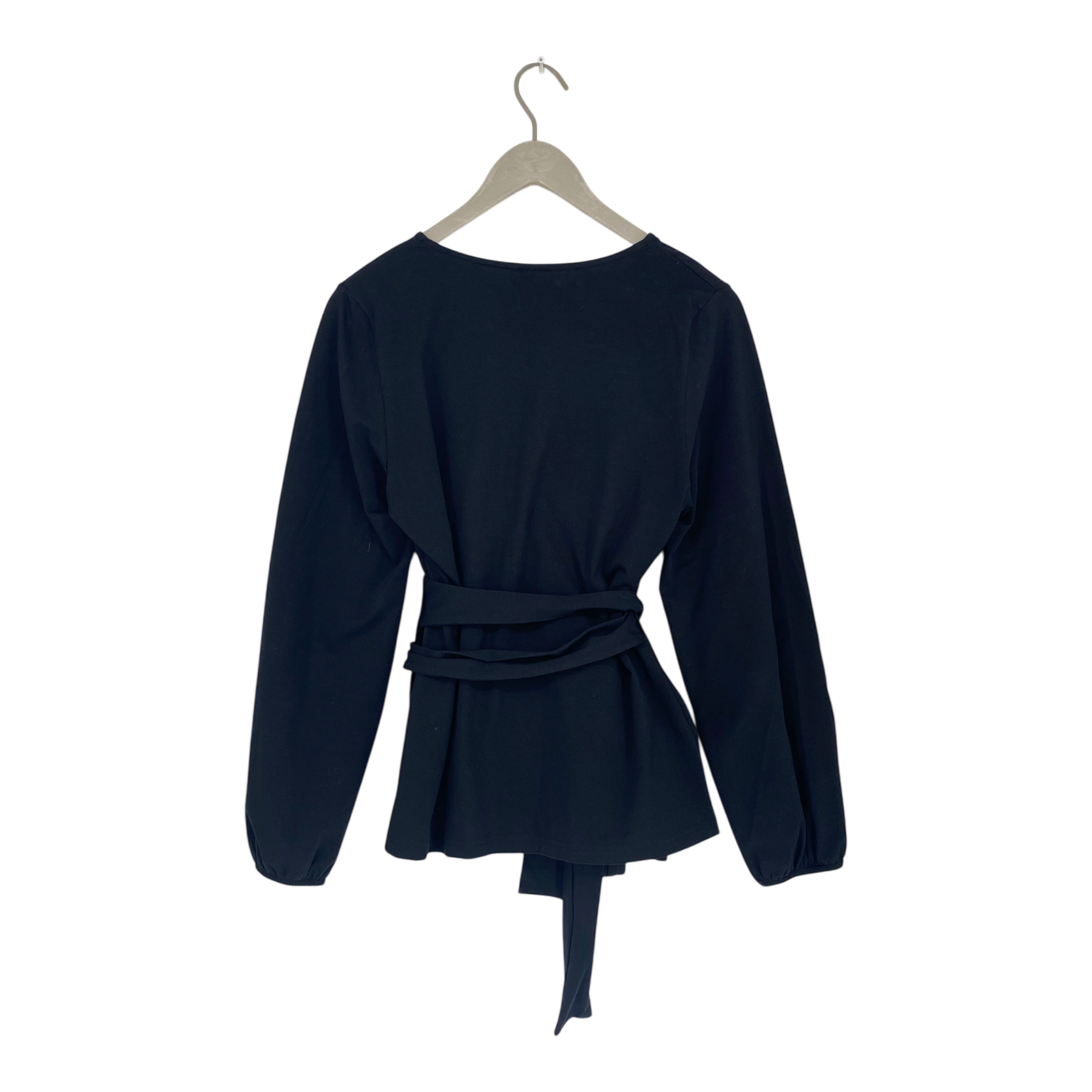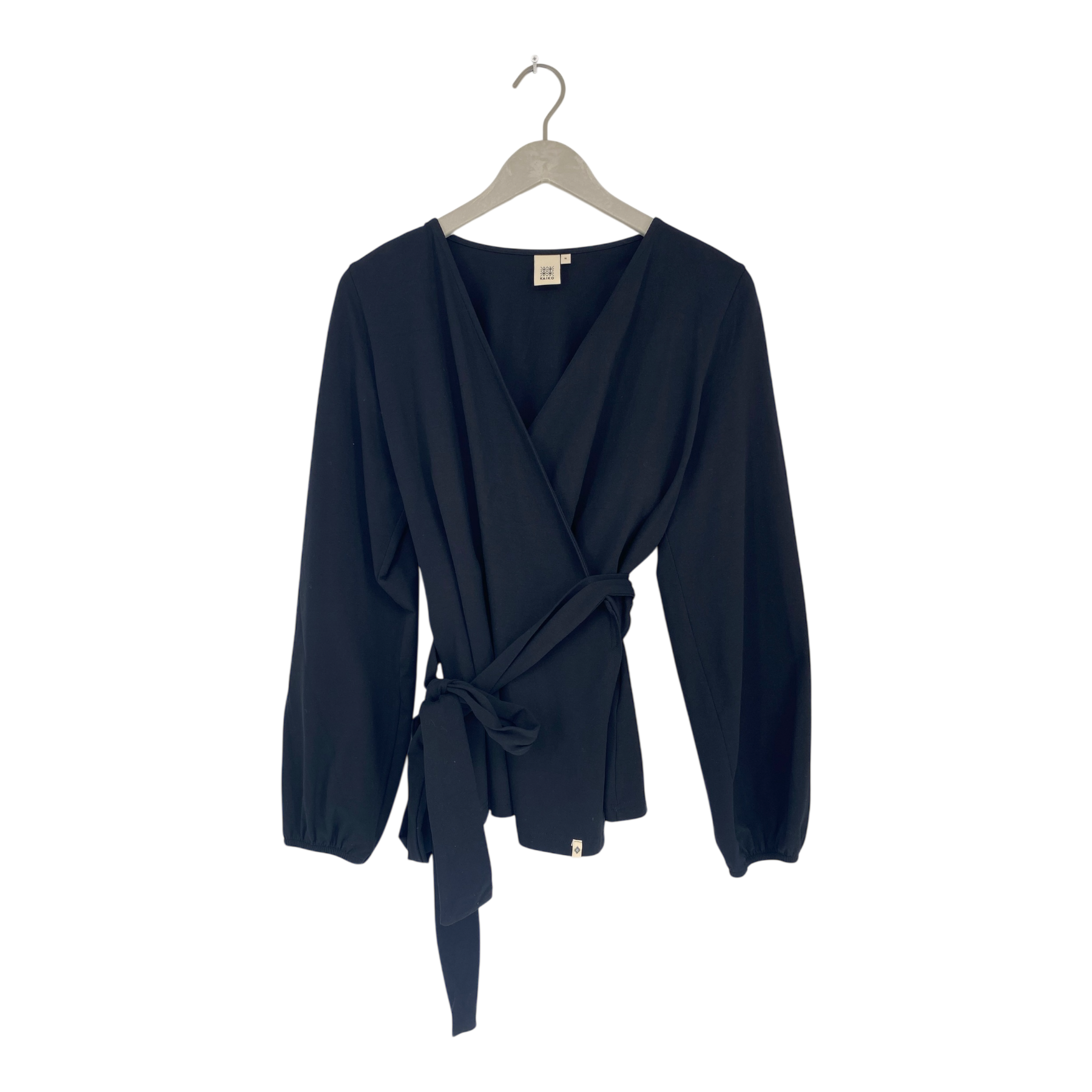 Kaiko Soft Wrap blouse has loose balloon-sleeves and ties at the waist with long straps. The cuffs are elasticated, and gathering at the shoulders creates additional volume to the sleeves.