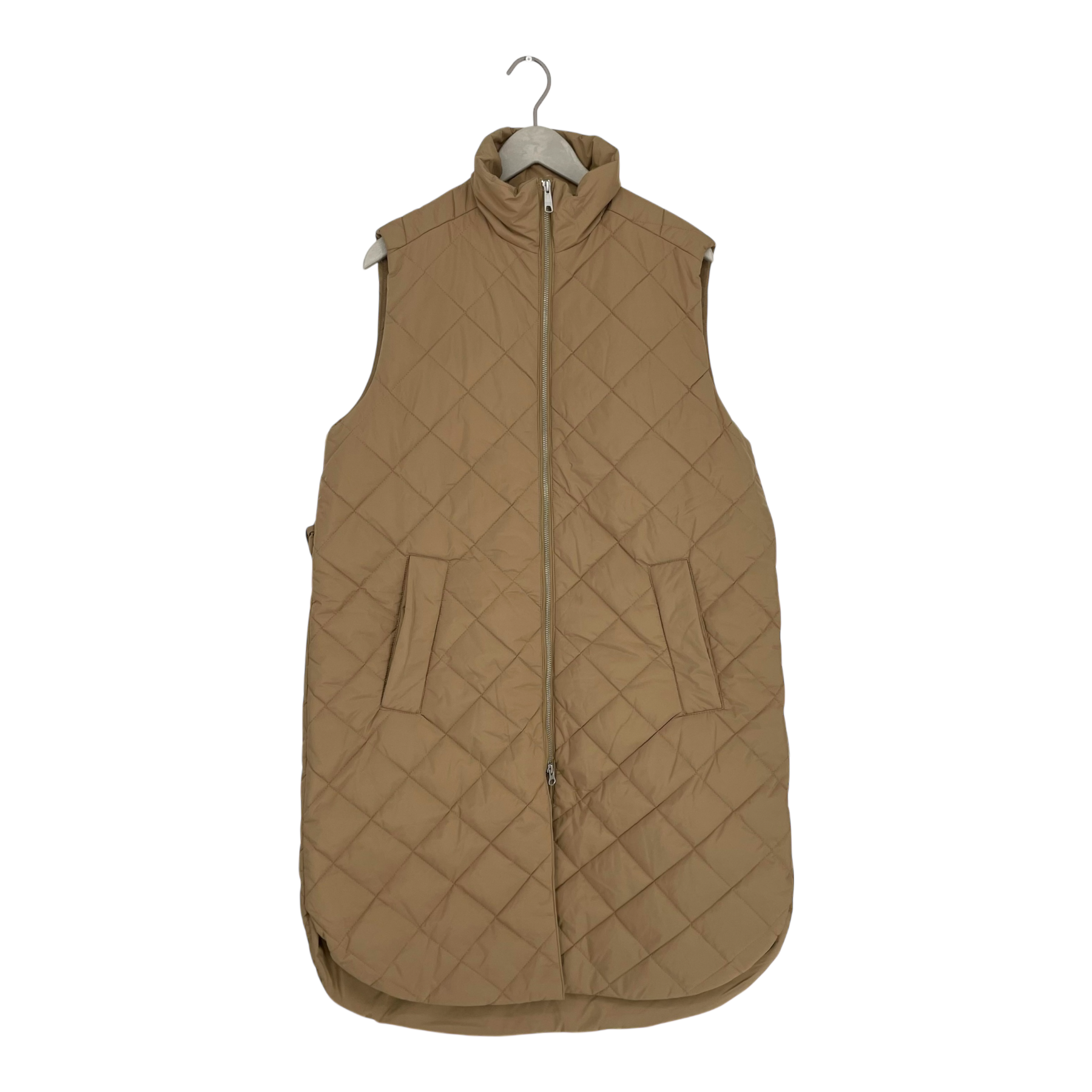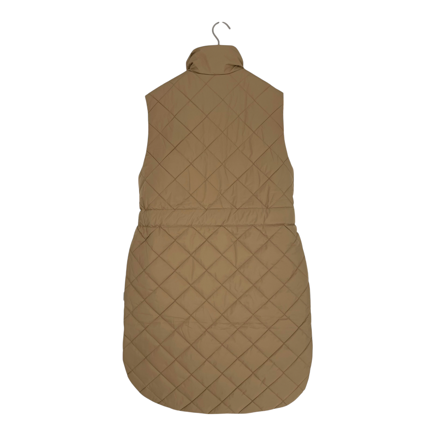 Makia Aura vest is a relaxed-fitting longer quilted vest with a stand-up collar and curved hem. The Aura Vest is finished with welt pockets and belt detail on the waist. For milder weather or layering.