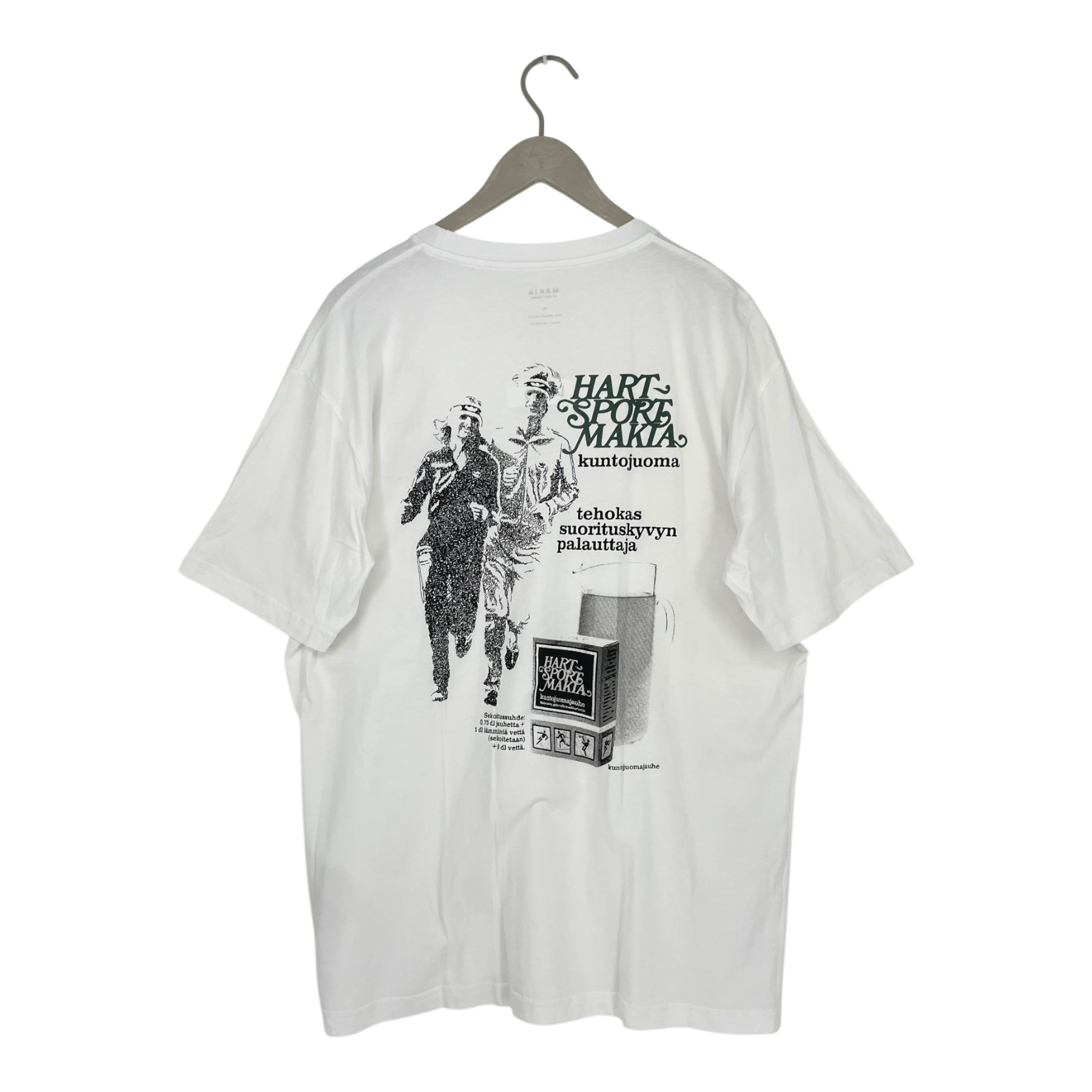 Makia t-shirt with a Hart Sport Makia logo on the front and a print on the back. Longer style.