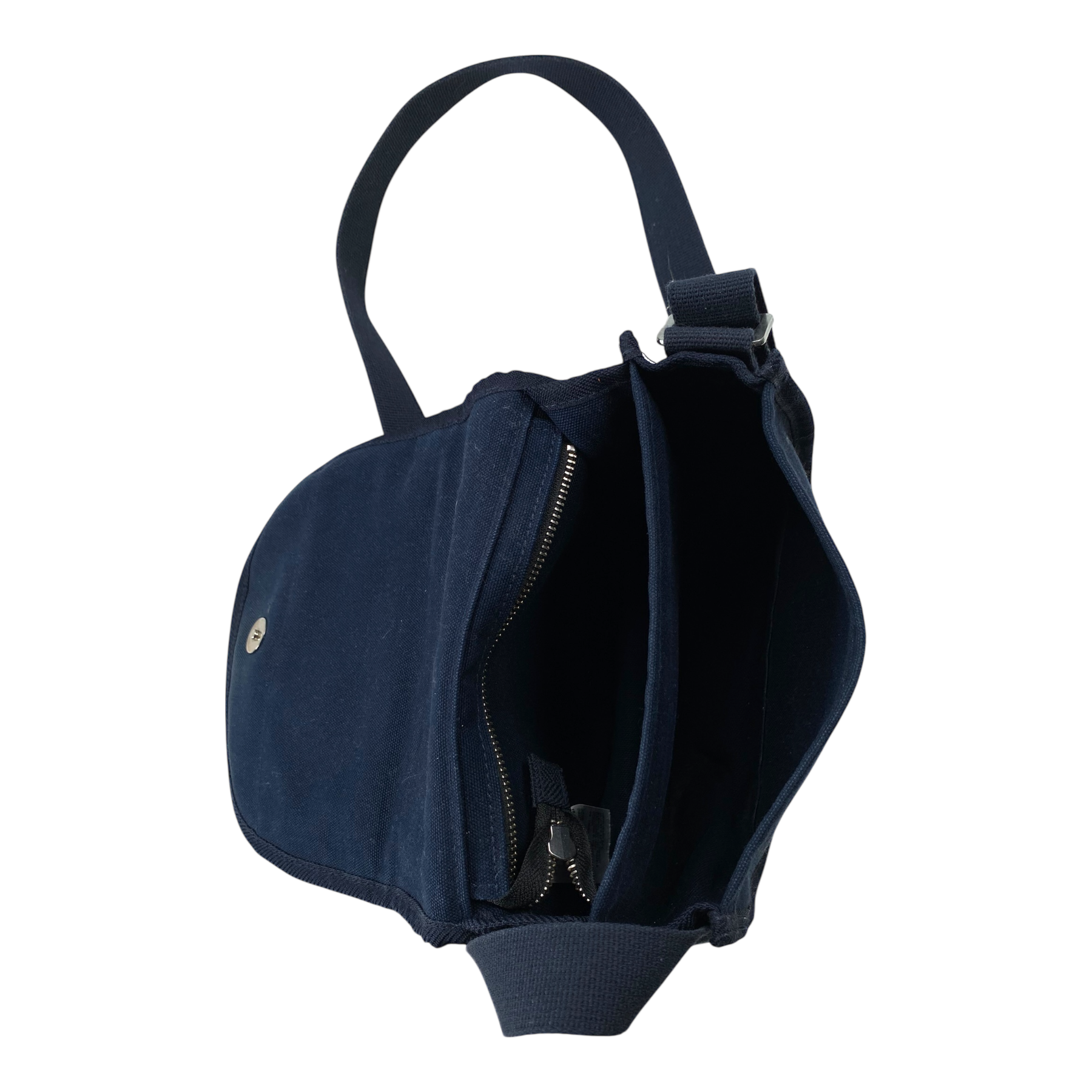 Marimekko canvas cross body bag with an adjustable strap, two main pockets under the front cover.