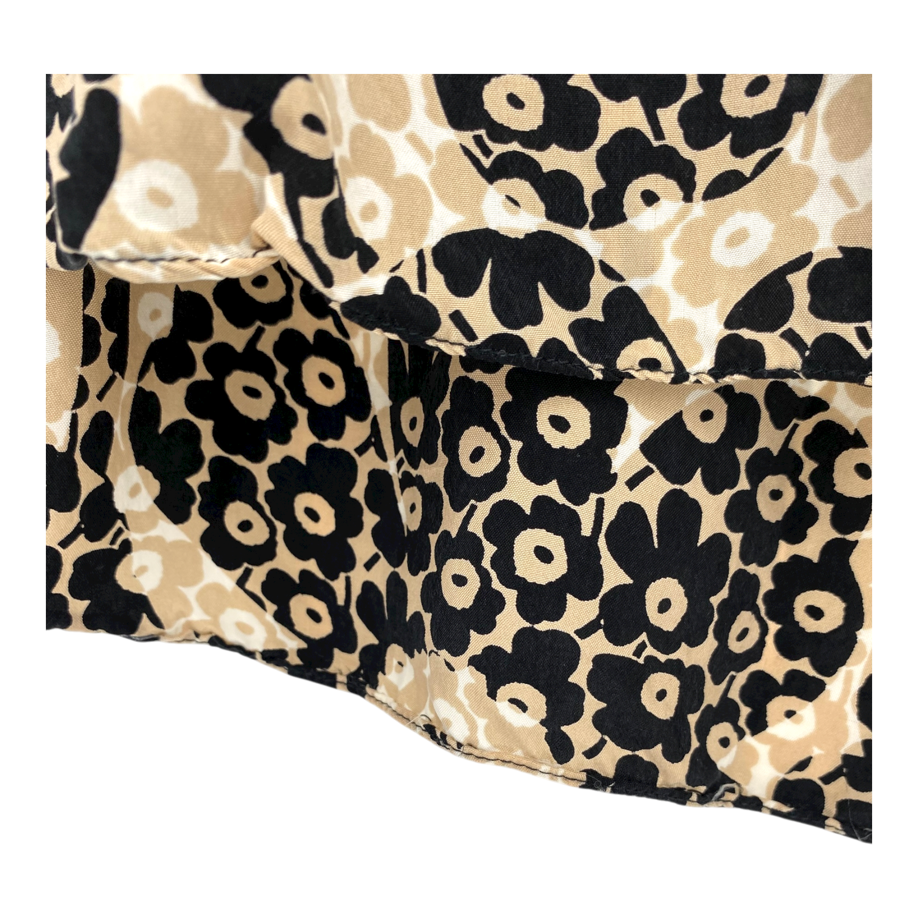 Marimekko long sleeve Hurmaava blouse in the Unikot print. The Hurmaava blouse is a tunic length silky shirt with buttoned cuffs and a short button strip on the front. The item has some pulls of thread and two tomato stains on the sleeve as shown in the pictures but is otherwise in very good condition.