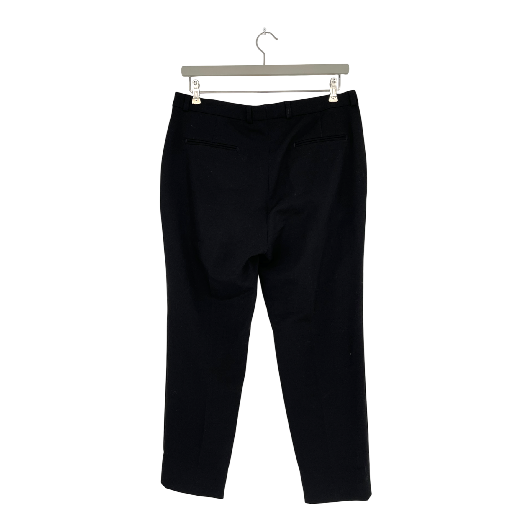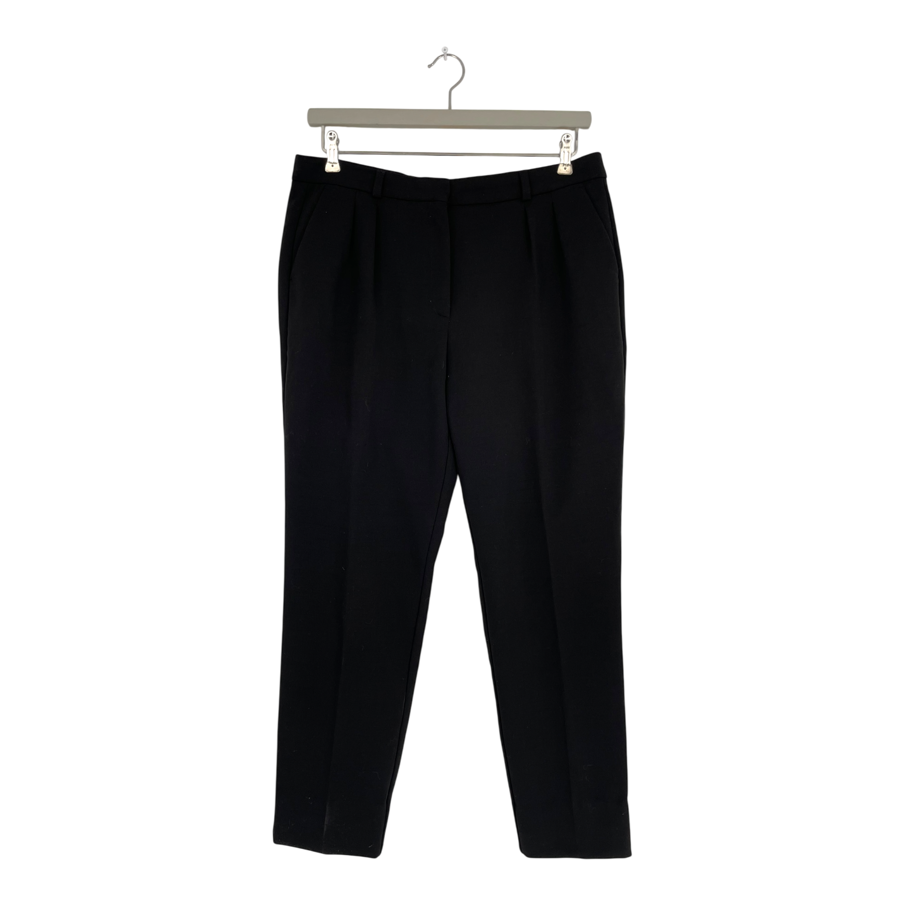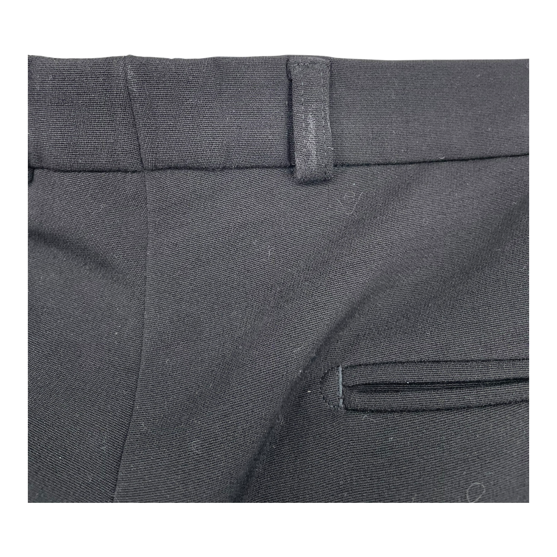 Marimekko Hurrikaani pants are made of a woven wool-poly blend. The Hurrikaani pleated pants have a slightly tapered cut. The waistline has belt loops and a hidden front clasp and button, as well as zipper closure. Front pockets are diagonally cut; back pockets are horizontal slits. The pants have a discoloration on a belt loop on the back, as shown in the picture.