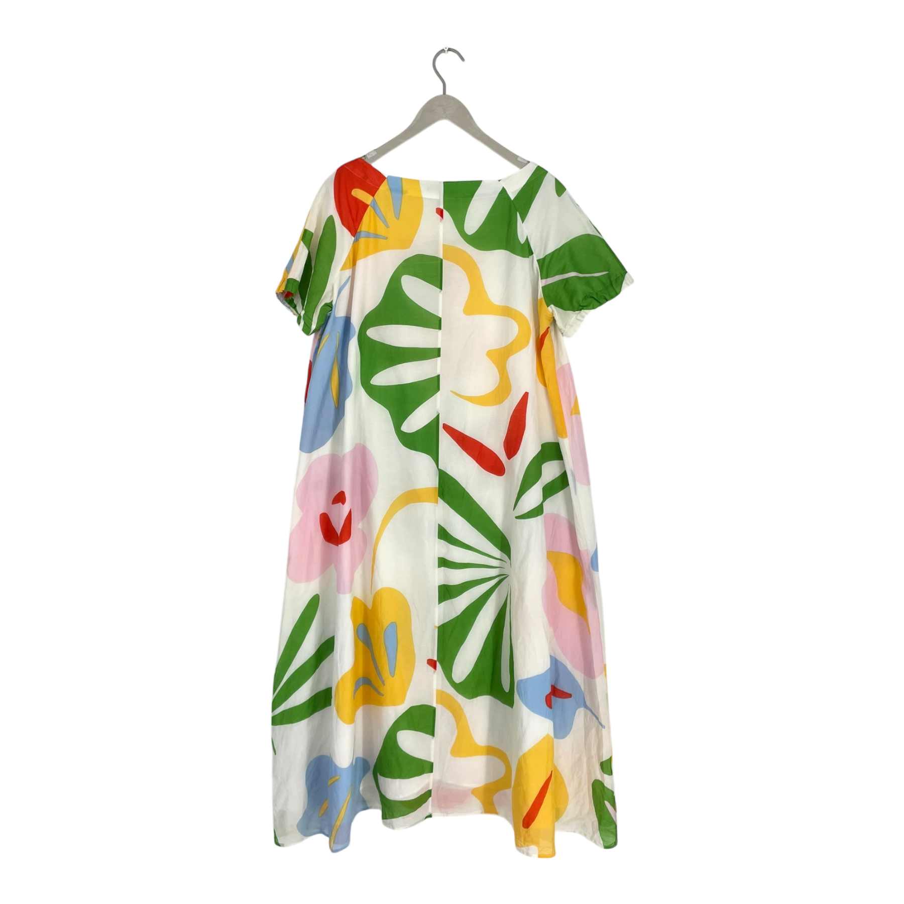 Marimekko Woven dress is crafted from lightweight cotton-silk and features the vibrant Väkevä viidakko print in natural white, red, and green tones. The dress has a lining, an open round neckline, and short raglan sleeves with elasticized cuffs. Its long A-line silhouette falls to mid-calf, creating a comfortable and elegant fit. The dress is in good overall condition, with only slight pilling under the arms.