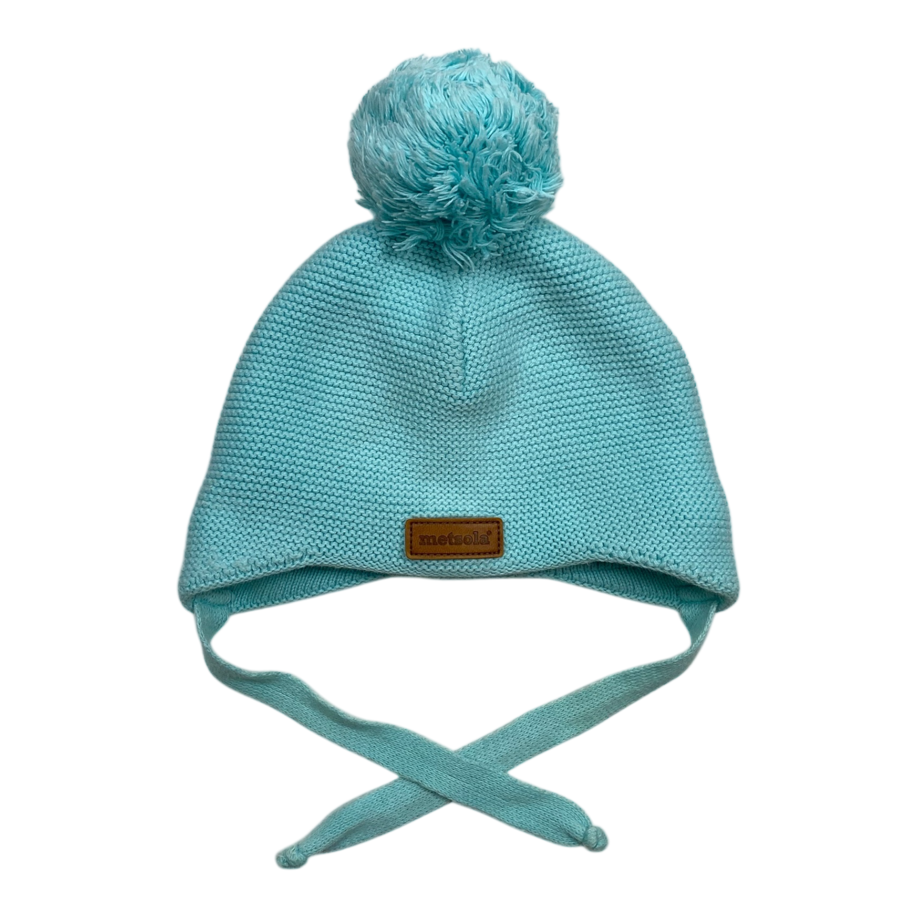 Metsola knitted beanie with a pom and strings to tie with.