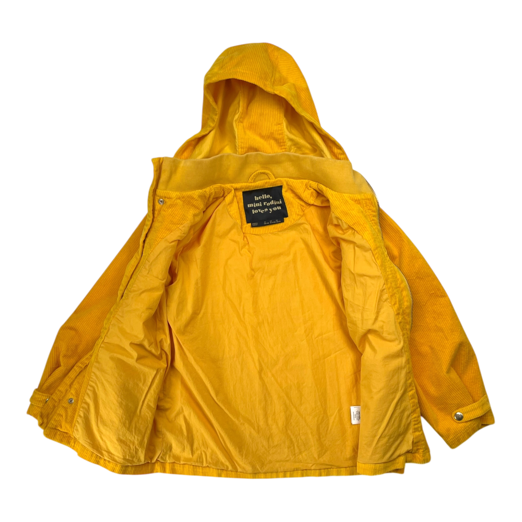 Mini Rodini corduroy jacket with a detachable hood, multiple pockets with snap buttons and ebroidered details.