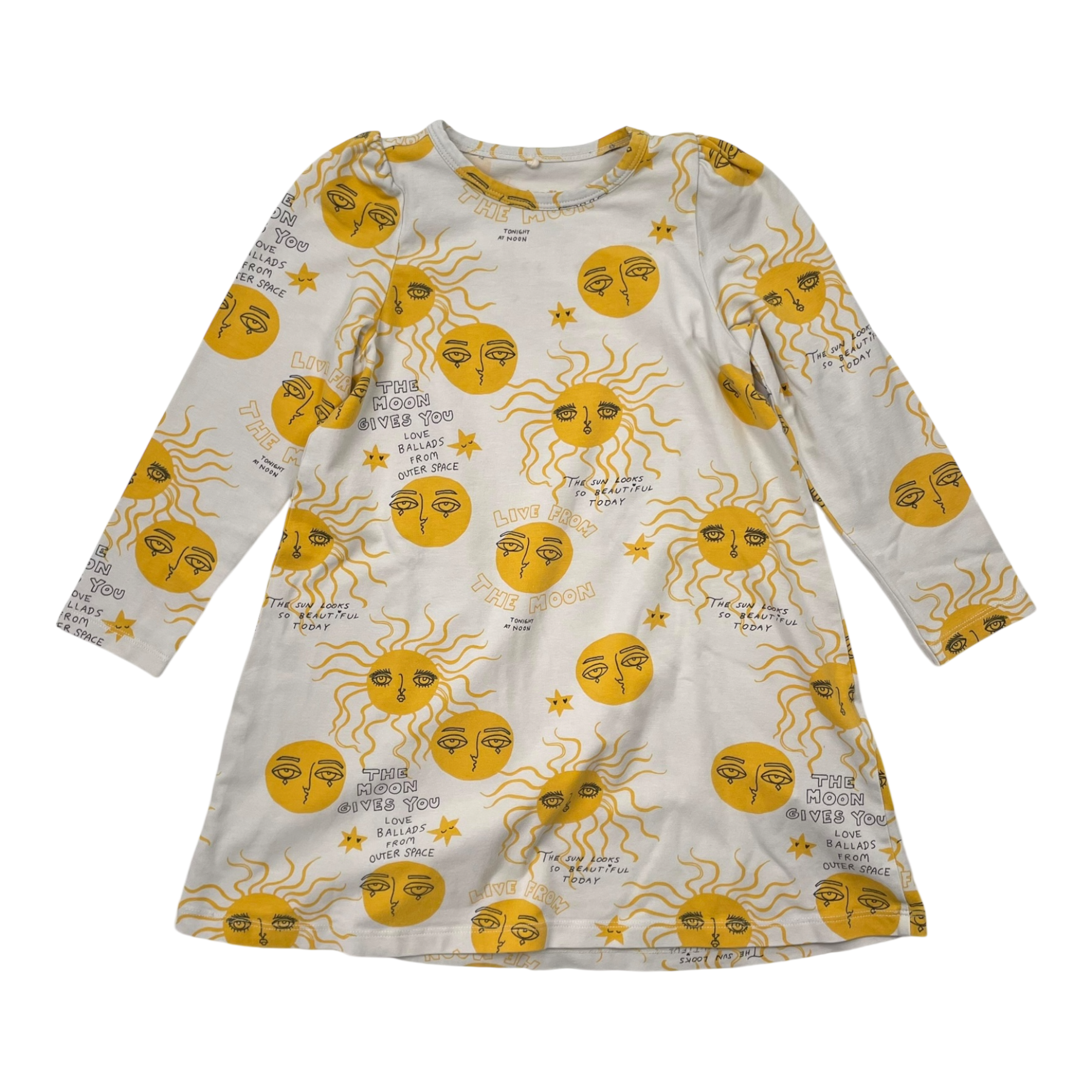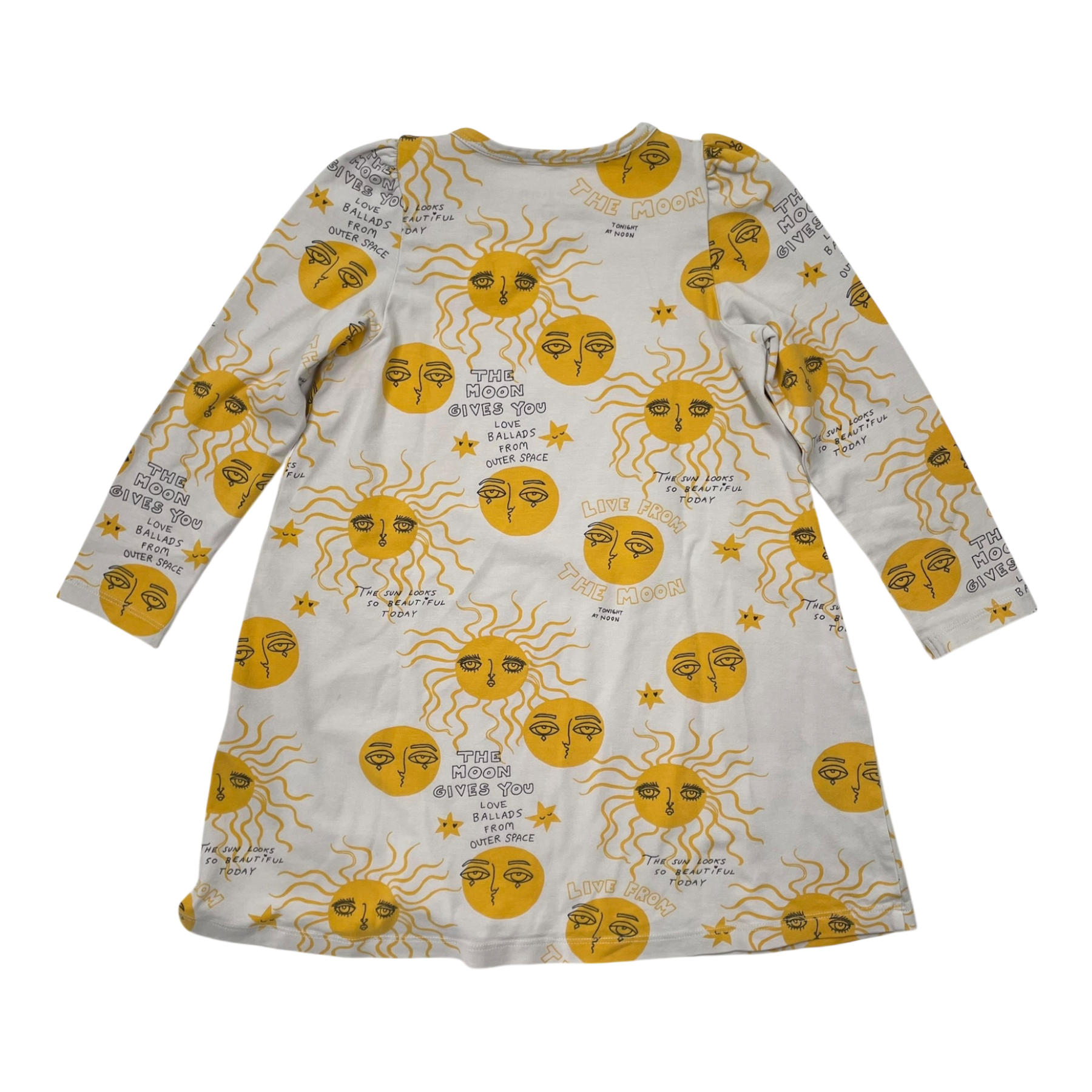 Mini Rodini dress in moon print. The shoulders are slightly puffed.