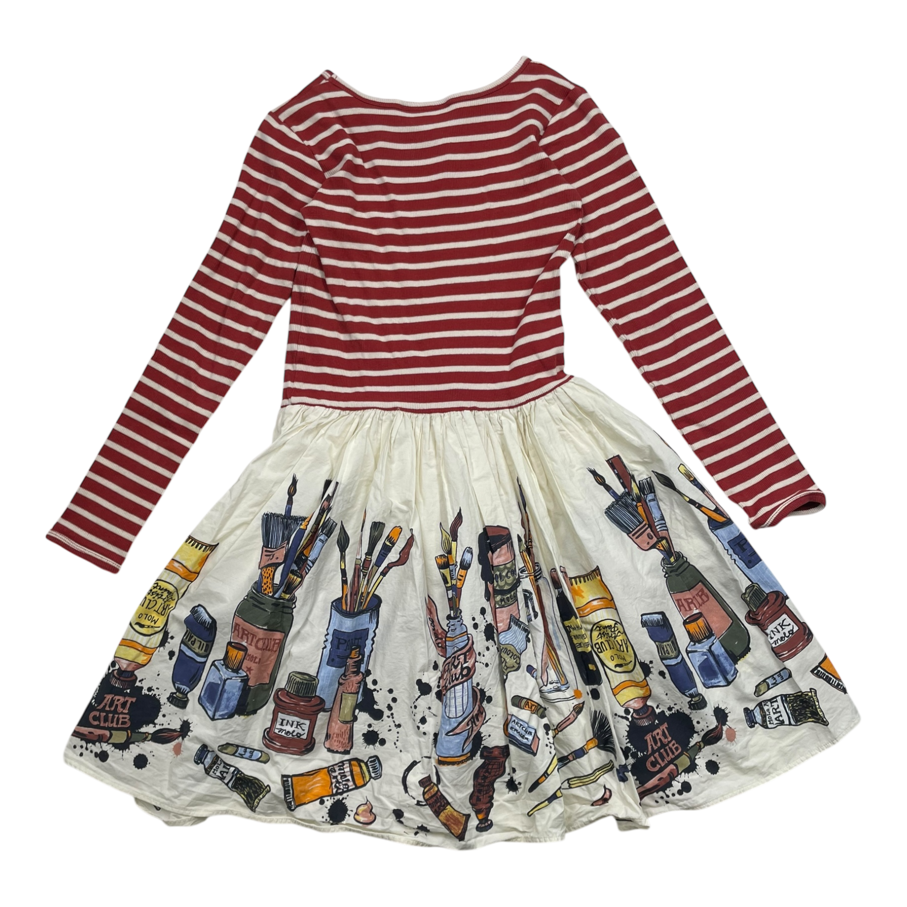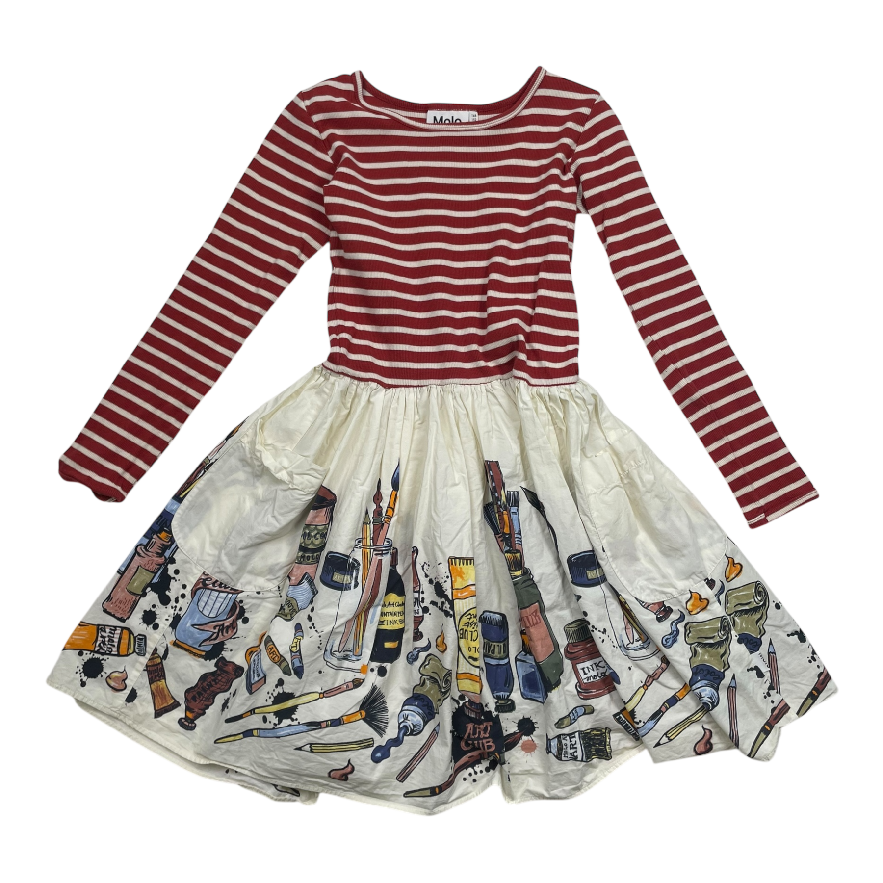 Molo rib dress in art club print. The top is made from rib fabric and the bottom is woven cotton with two big pockets.