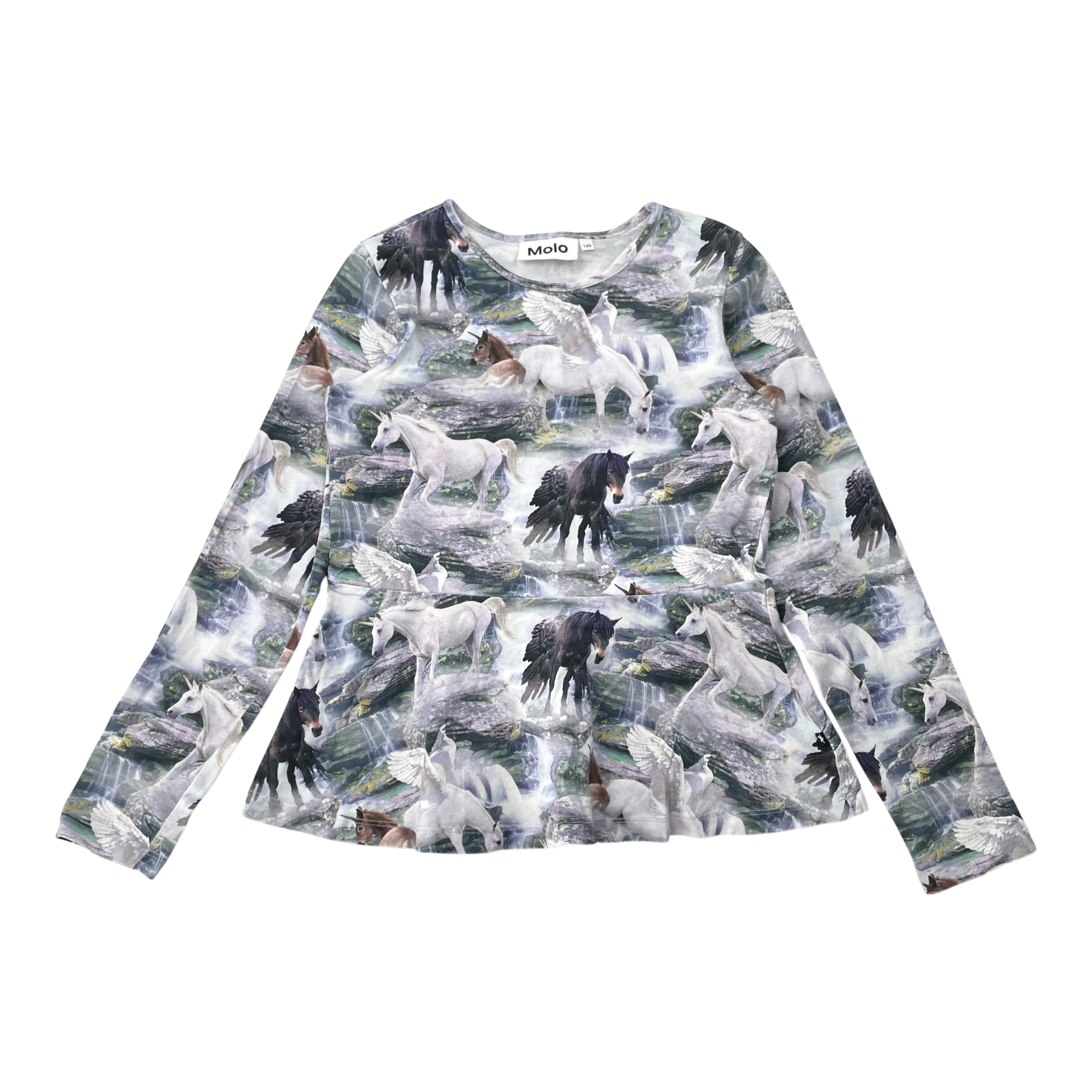 Molo long sleeve peplum style shirt in mythical creatures print.