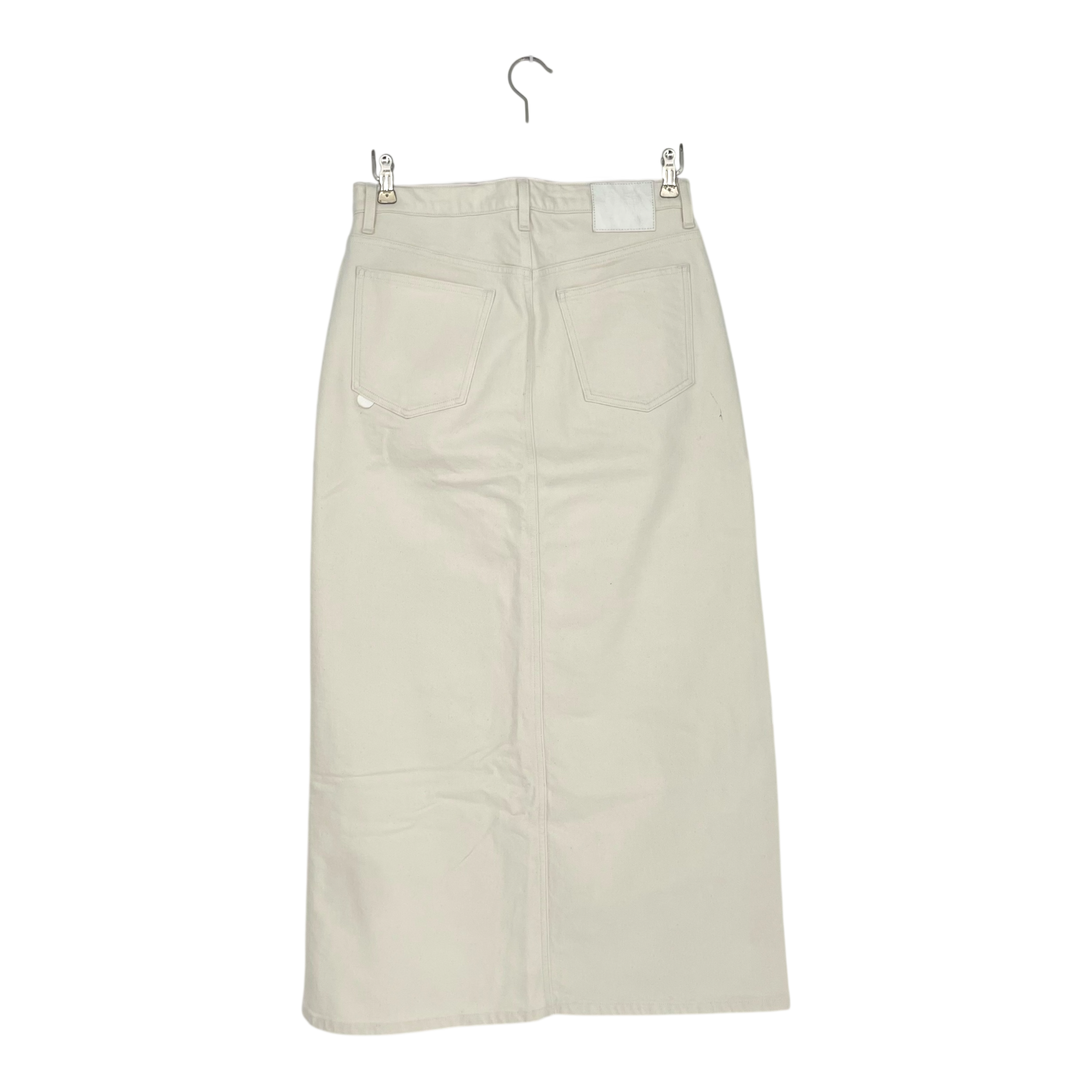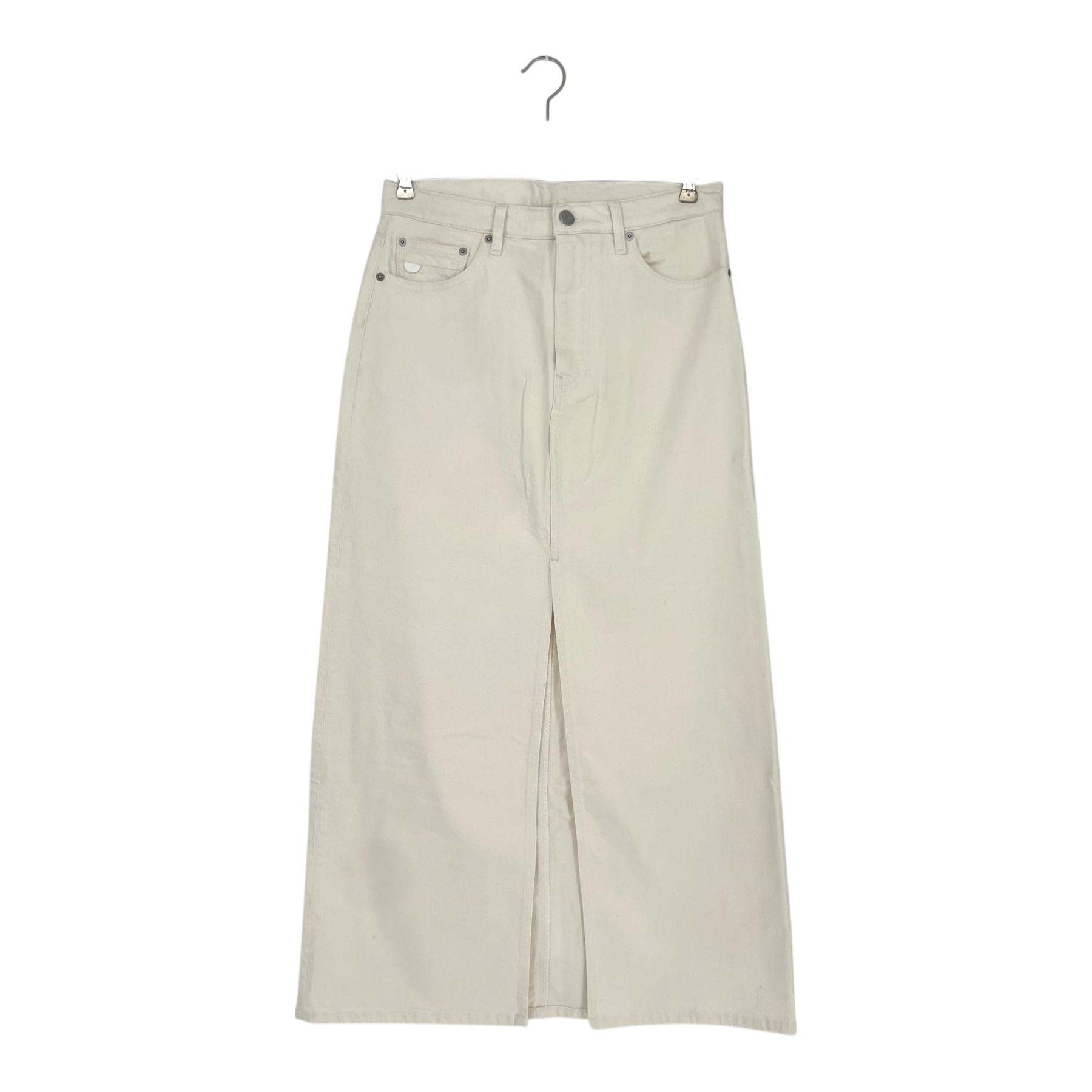 Mud Jeans women's long skirt with back pockets and a slit in the front.