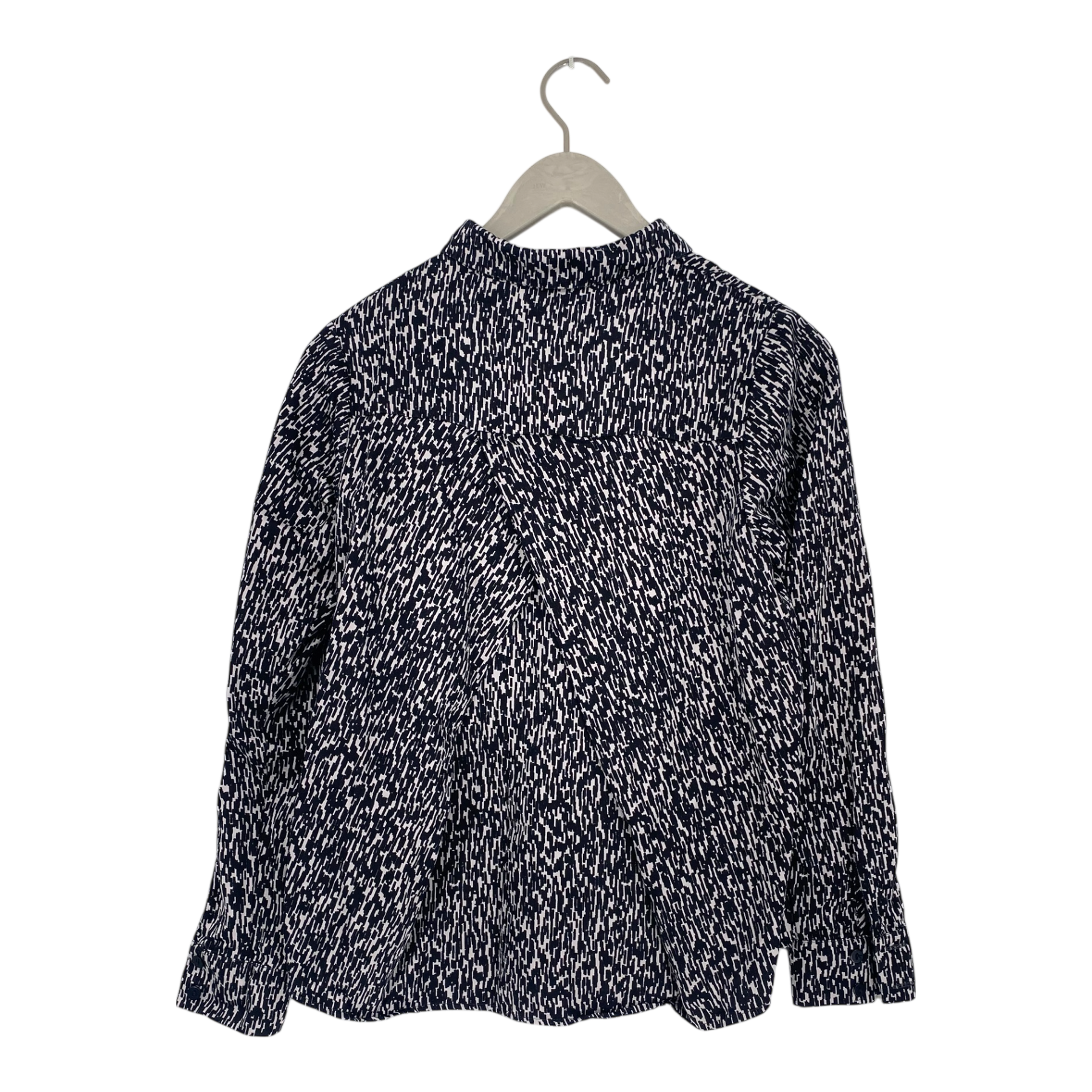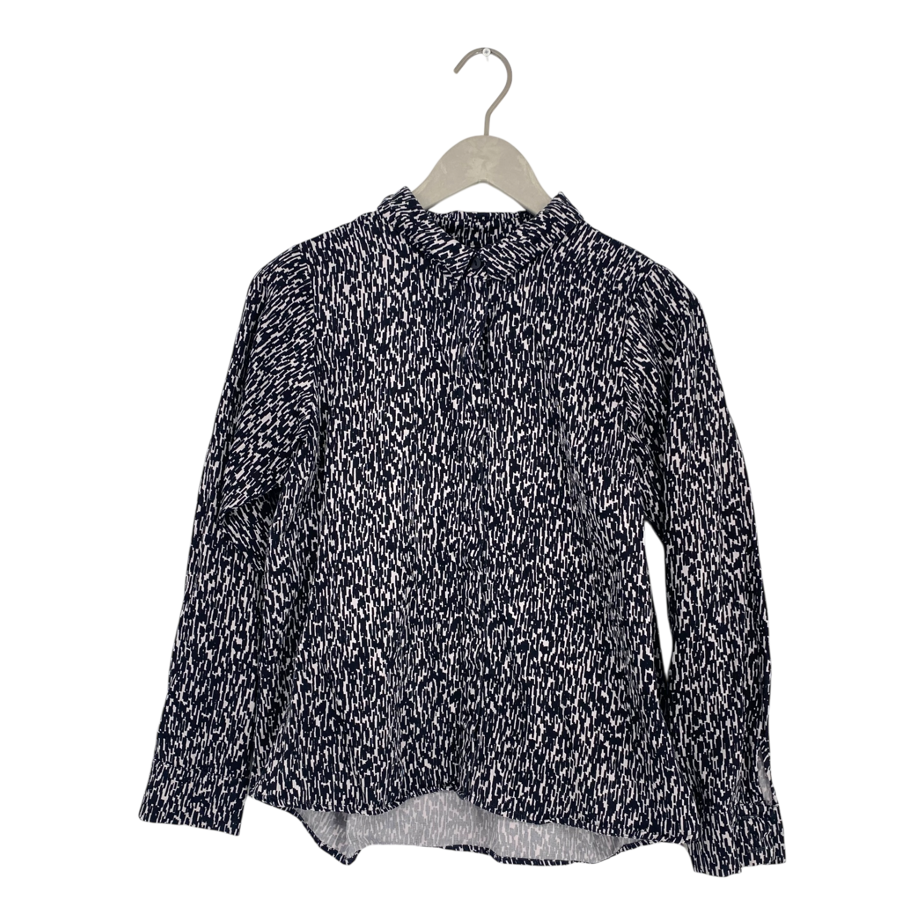 Papu women's lyocell button-up shirt with collar. Hidden buttons down the front. Long sleeves with slits and buttons on wrist band. Round neckline and shirt collars. Pleats on the back.