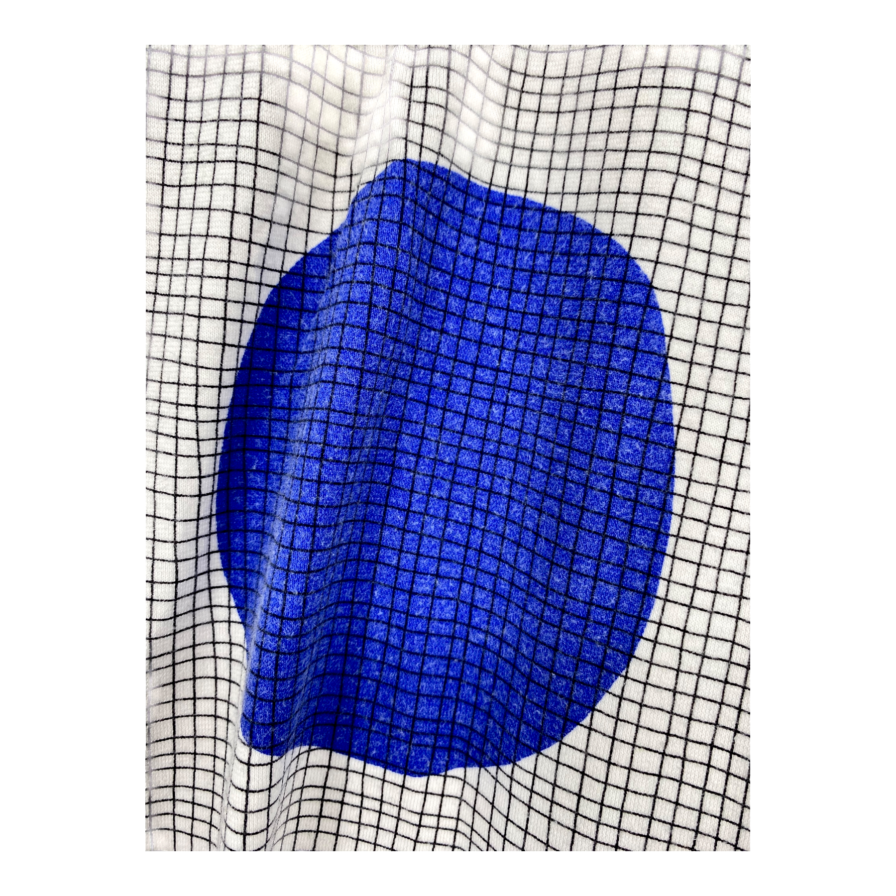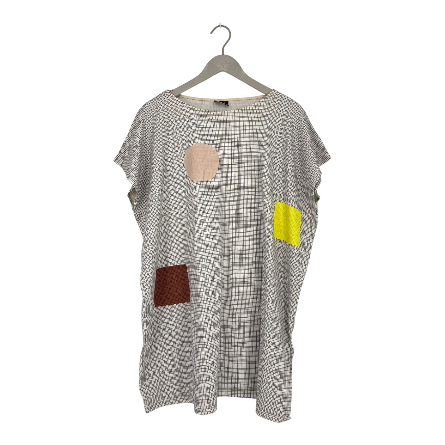 Papu women's tricot sleeveless tunic dress in the tiny grid and abstract shapes print. The item is quite worn from the wash, the colors and fabric show signs of wear as seen in the pictures.