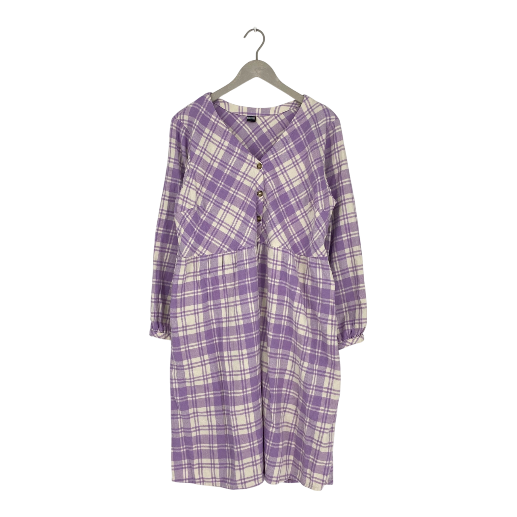 R-collection woven long sleeve flanel dress with a round neckline and buttons on the shirt half of the front. Spare button included in the laundry tag.