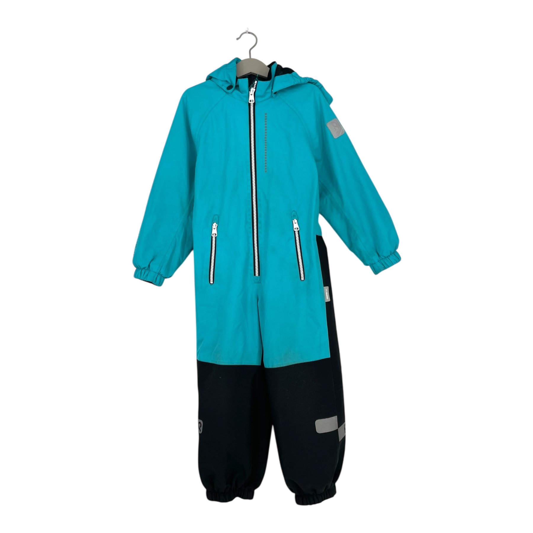 Reima Kapelli midseason overall is originally waterproof up to 10 000mm water column. All seams are sealed waterproof and material is very durable. The overall has zipper pockets, detachable hood and detachable foot loops. The item has some stains as well as signs of use in the knee area.