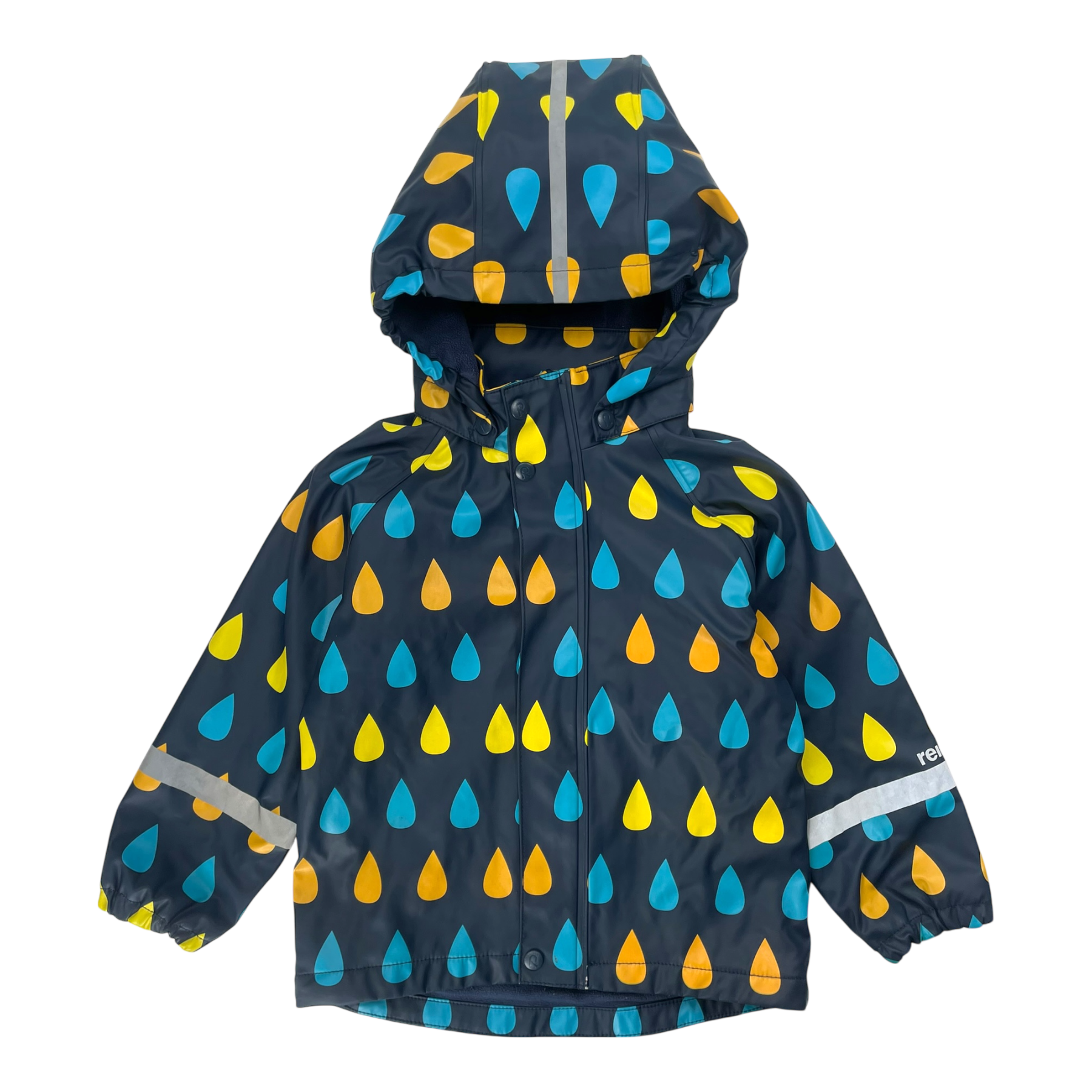 Reima Koski rain jacket with detachable hood, zip closure, and a warm fleece lining. This warm rain jacket has elasticated cuffs and reflective details on the sleeves and hood.