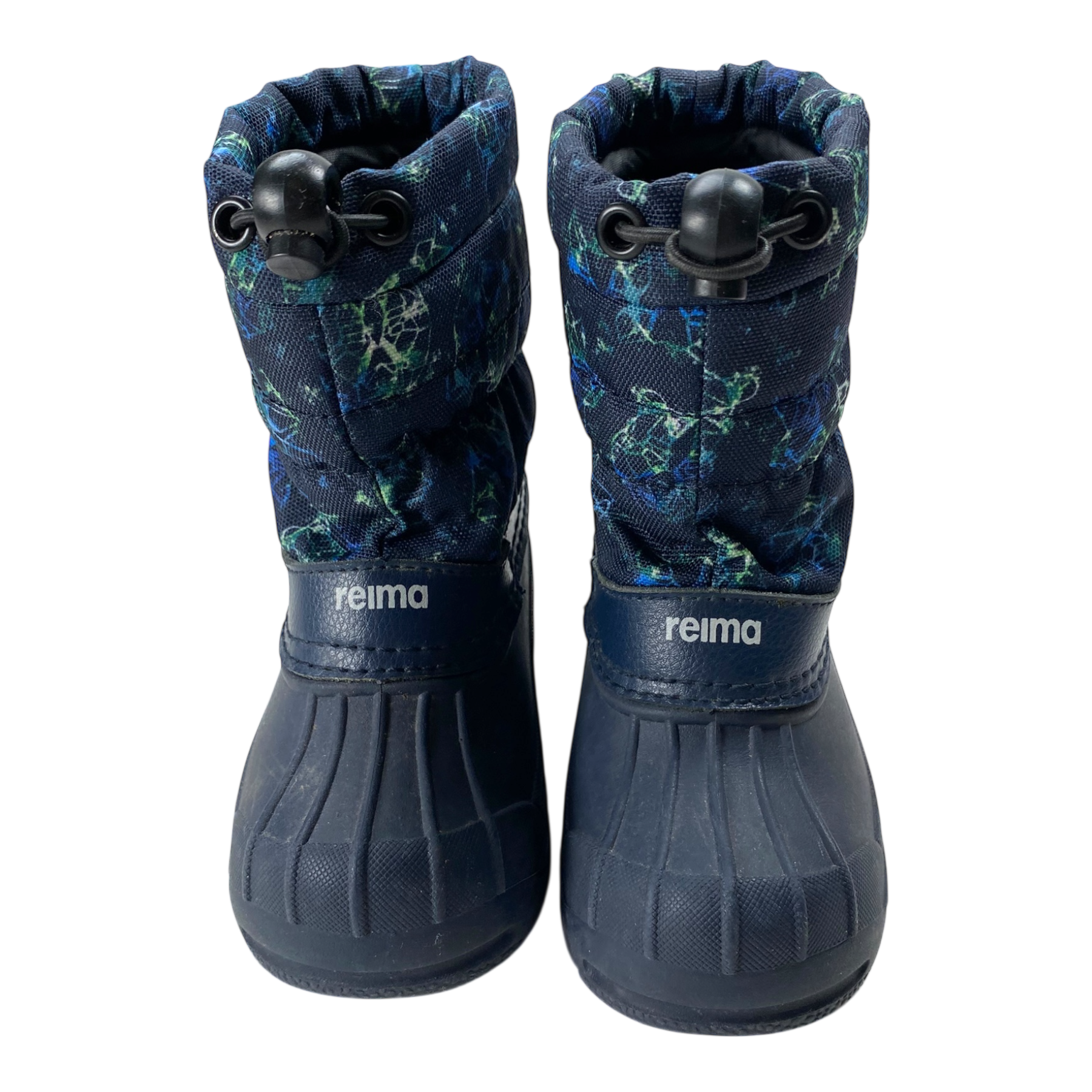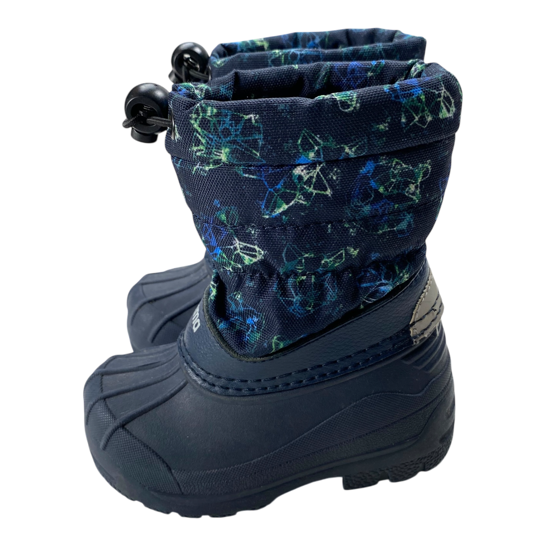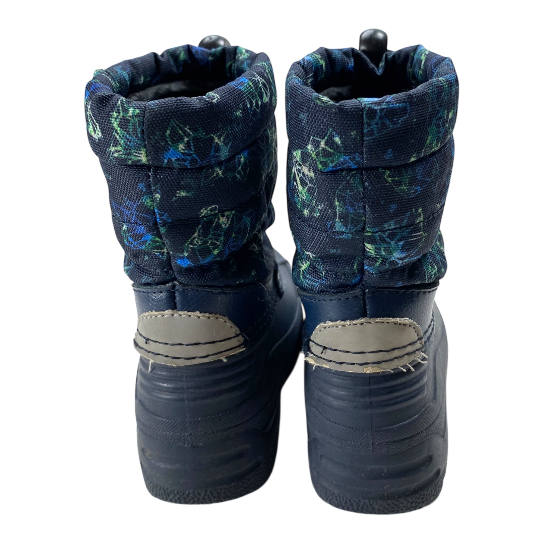 Reima kids' Nefar duck snow boots equipped with a completely waterproof galosh section in durable thermoplastic rubber for protection from slush on wet days. The item has some signs of use.