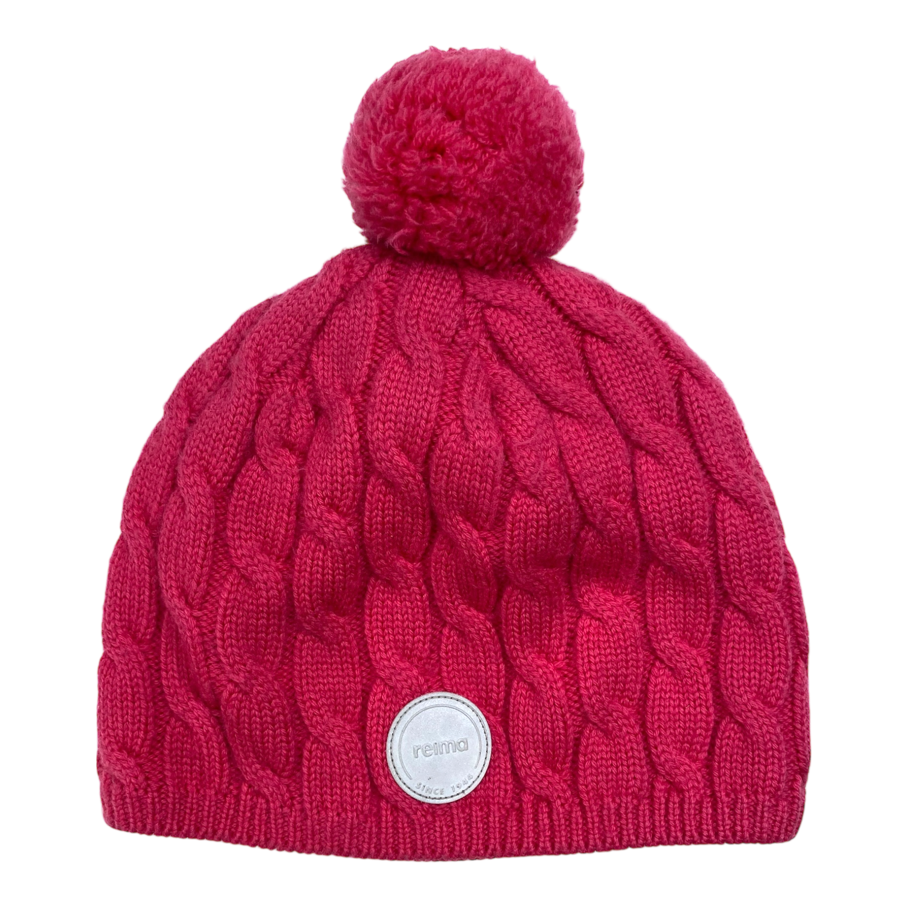 Reima Nyksund beanie with pom on the top and a reflective logo. The fabric is slightly fluffed.