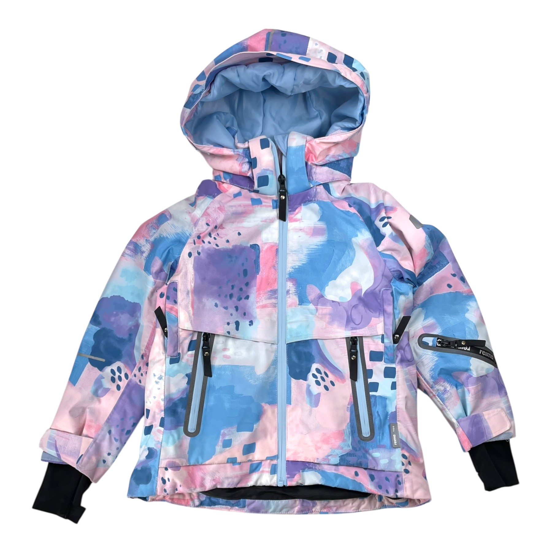 Reima Posio winter jacket with detachable hood, adjustable cuffs, snowlock on the waist, smart ski pass sleeve pocket, and pockets with water-repellent zips. Sealed seams and the fabric is originally waterproof, up to 10,000mm water column.