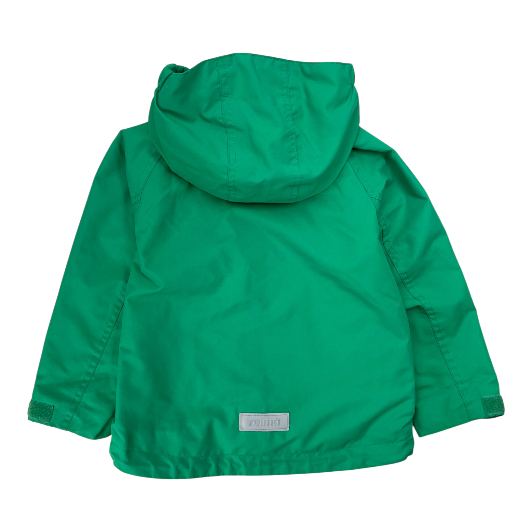 Reimatec Soutu jacket with a detachable hood, two zip pockets on the sides, and adjustable elastic at the hem. The material is originally waterproof and the seams are sealed.