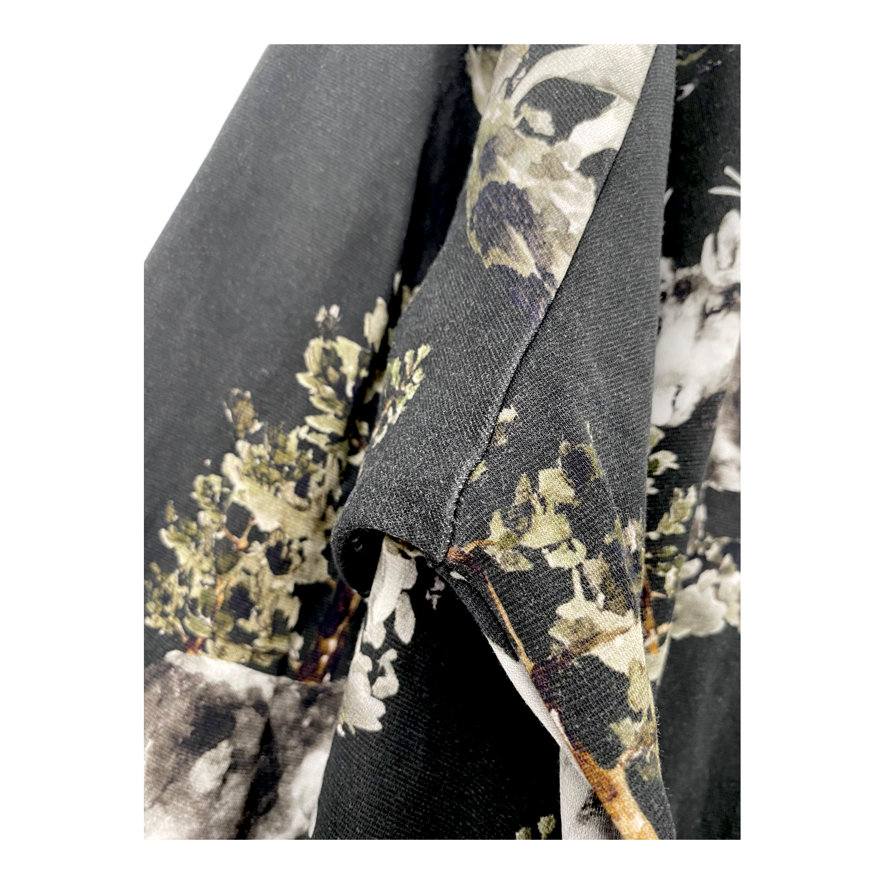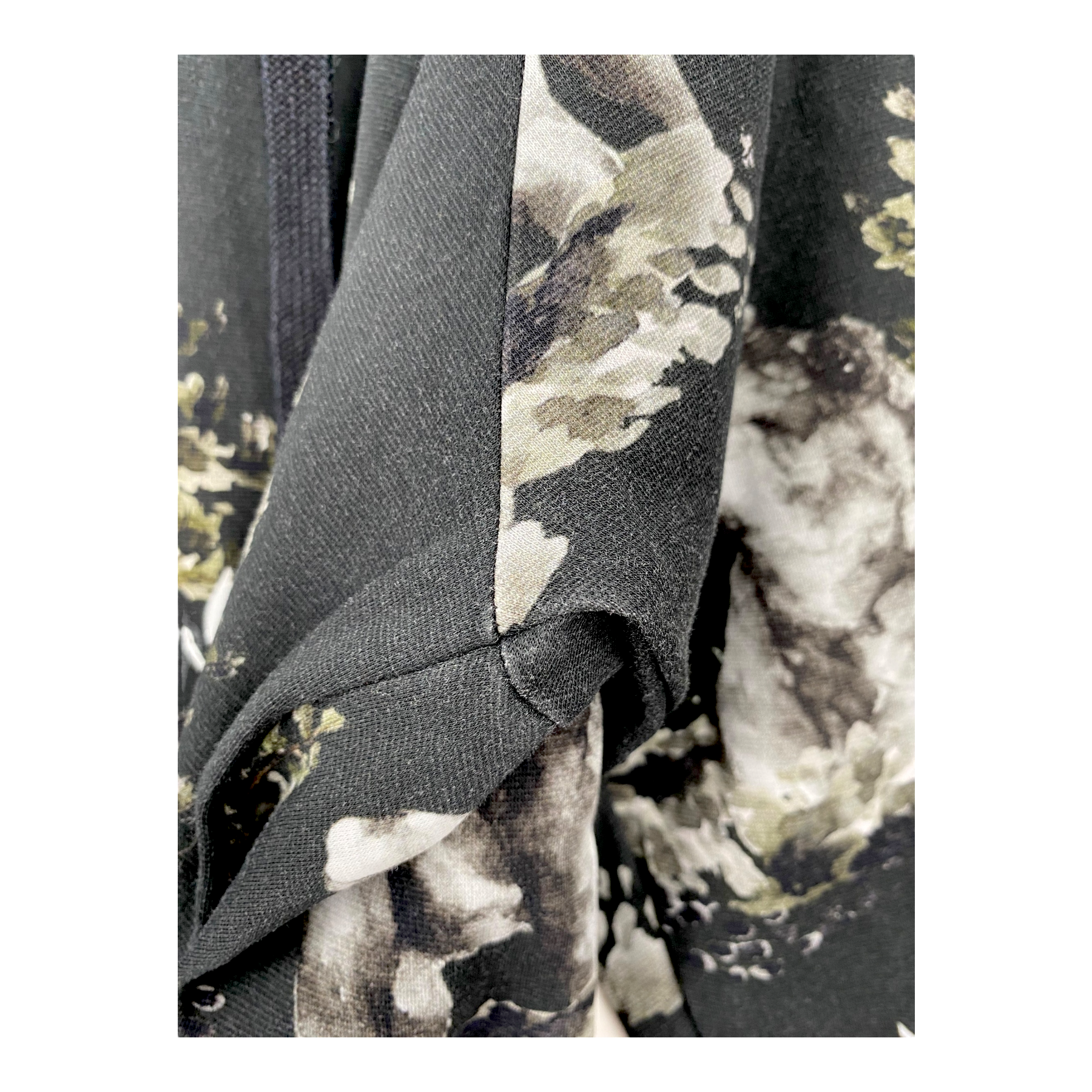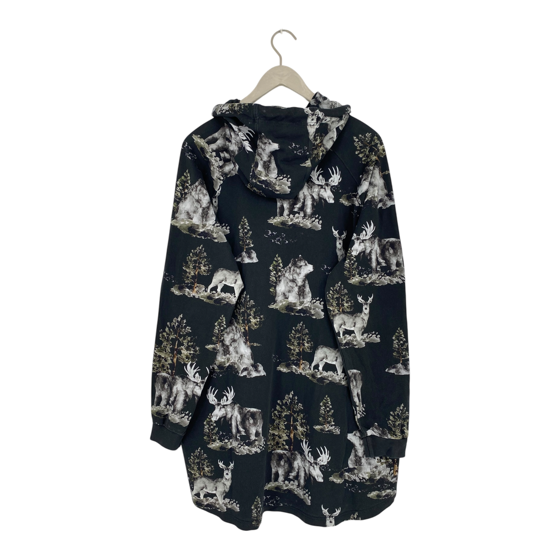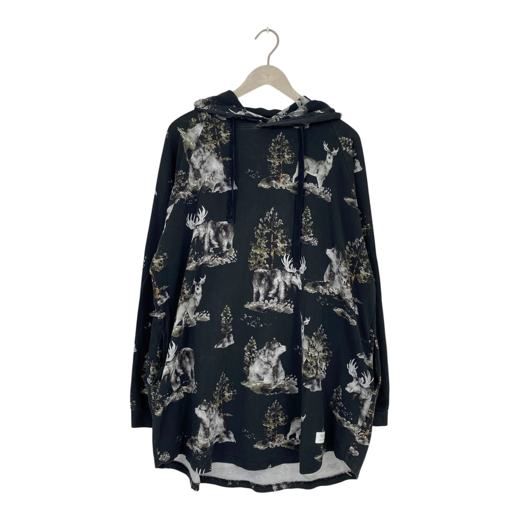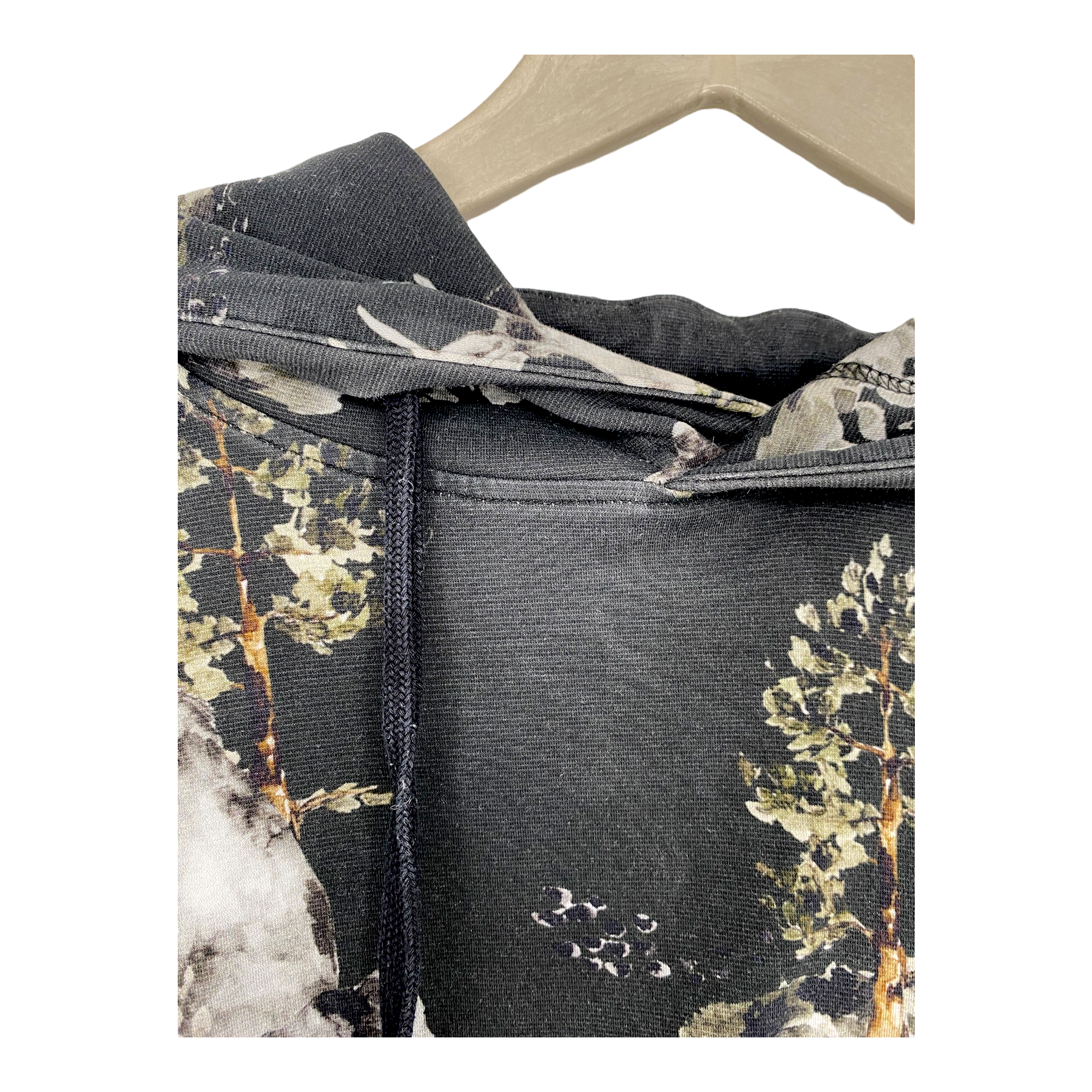 Riva Clothing hoodie in the Metsä print. The fabric and color of the item show some signs of fading, especially on the seams.